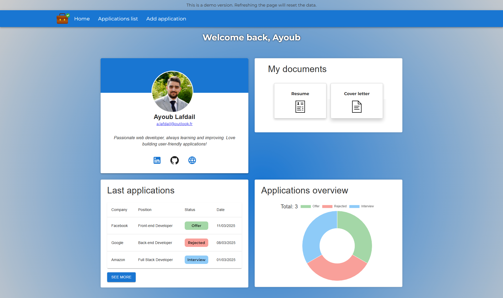 JobTrackR est une application web conçue pour aider les chercheurs d'emploi à gérer leurs candidatures de manière efficace. Elle permet de suivre les offres d'emploi, d'organiser les candidatures et de recevoir des rappels pour les relances. Grâce à une interface intuitive et des fonctionnalités pratiques, JobTrackR simplifie le processus de recherche d'emploi et aide les utilisateurs à rester organisés.